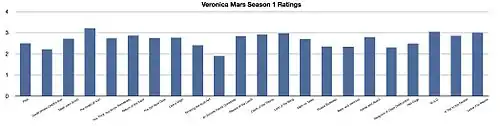 The series was critically acclaimed, and appeared on several fall television best lists.[2] The first season garnered an average of 2.5 million viewers per all 22 episodes in the US. Out of all regular primetime programming that aired during the 2004–2005 American television season, Veronica Mars ranked #148 out of 156, according to the Nielsen ratings system.[3] The pilot was watched by 2.49 million viewers,[4] while the finale was watched by 2.99 million viewers.[5]