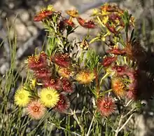 The flowers are arranged in corymb-like groups near the ends of the branches, each flower on a stalk 10–25 mm (0.4–1 in) long. The floral cup is about 3 mm (0.1 in) long with a slightly warty, glabrous surface. The sepals are yellow, turning red with age, 5–7 mm (0.2–0.3 in) long, spreading with 10 to 12 hairy lobes. The petals are a similar colour, spreading, 5–6 mm (0.20–0.24 in) long and have long, spreading, thin, finger-like projections. The style is 4–6 mm (0.16–0.24 in) long, straight and glabrous. Flowering time is from August to November.[2]