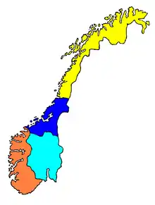 Norway divided by the prevalence of four dialect groups: