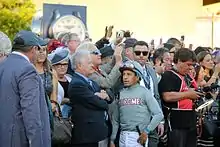 In the fall of 2014, Espinoza also became the regular rider of American Pharoah, trained by Bob Baffert and owned by Ahmed Zayat. Espinoza started with the colt's second race, the Grade I Del Mar Futurity on September 4.[18] The pair went on to win the FrontRunner Stakes.[19] The colt was scratched from the Breeders' Cup Juvenile,[20] but the pair reunited in 2015 with wins in the Rebel Stakes and Arkansas Derby.[18] American Pharoah and Espinoza then won the 2015 Kentucky Derby.[21] After the win, Espinoza said, "I feel like the luckiest Mexican on Earth."[22] However, his performance attracted some scrutiny as he struck the horse 32 times with his whip during the race.[23] Kentucky racing stewards reviewed Espinoza's ride and ruled that his whip use did not violate state regulations.[24] On May 16, 2015, Espinoza and American Pharoah won the 2015 Preakness Stakes on a sloppy track, setting up Espinoza's third attempt at the Triple Crown.[25] His June 6, 2015, victory at the 2015 Belmont Stakes made him the oldest jockey to win the Triple Crown, as well as the first Latino jockey to do so.[26] For 3 years, he held the distinction of being the last jockey, and the oldest, to sweep the Triple Crown until Mike Smith did it aboard Justify in 2018. On October 31, 2015, Espinoza rode American Pharoah to victory in the Breeder's Cup Classic, becoming the first jockey in history to win horse racing's Grand Slam—the Triple Crown and the Breeder's Cup Classic.
