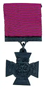 The Victoria Cross for New Zealand is identical to the original design.[7] The decoration is a cross pattée, having straight edges and approximately 36 millimetres (1.4 in) square, bearing a crown surmounted by a lion, and the inscription "For Valour". The cross is suspended by a ring from a seriffed "V" to a bar ornamented with laurel leaves, through which the ribbon passes. The reverse of the suspension bar is engraved with the recipient's name, rank, number and unit. On the reverse of the medal is a circular panel on which the date of the act for which it was awarded is engraved in the centre. The ribbon is crimson, 38 millimetres (1.5 in) wide.[9][10]