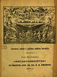 The newspaper published news from Lithuania (both republished from other newspapers and original stories by its own correspondents), from United States, from around the world (mostly Europe), and from Lithuanian Americans (including reports on Lithuanian parishes and societies).[43] It also published works of fiction and more academic texts. Literary works included dramas by Aleksandras Fromas-Gužutis, poetry by Pranas Vaičaitis, translated poem Grażyna by Adam Mickiewicz, short story by Maria Rodziewiczówna,[44] play William Tell by Friedrich Schiller.[45] More academic texts included history of Lithuania by Simonas Daukantas[44] and Culture and Press by Emil Löbl.[46] These large serialized texts were often later published as separate books.[42] The newspaper helped organize protests in response to the Kražiai massacre of 1893 in Lithuania[47] and Lithuanian exhibition at the World's Fair in Paris in 1900.[48] It also sent a protest letter to William C. Hunt, Chief Statistician for Population, requesting to add Lithuanians as a separate nationality in the 1900 United States Census.[49] In 1903, it commemorated the 20th anniversary of Aušra by publishing memoirs of Jonas Basanavičius and Martynas Jankus.[50]