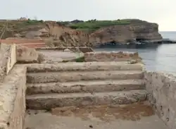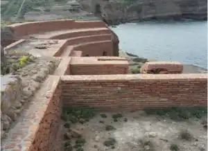 The baths are the best preserved part of the villa and are near to the residential area, along the edge of the cliffs where erosion has caused parts of the buildings to collapse. They are laid out on a different axis than the garden area. They included several pools and had a monumental stairway down to the sea.
