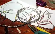 While some gut strings still use a knot to secure the tail end in the slot of the tailpiece, most modern strings use a "ball", a small bead often made of bronze. A frequent exception is the E string, which may be had with either a ball or loop end, since the smallest E-string fine tuners hold the tail of the string on a single small hook.