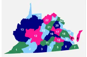 Reformers' efforts to adopt direct popular election of the Governor were defeated in favor of continuing election by the General Assembly.[7] Thomas Jefferson Randolph, Thomas Jefferson's grandson, proposed gradual emancipation, a suggestion which never made it out of committee onto the Convention floor.[8] The reformers lost on almost every issue. Nevertheless, even with the exaggerated Virginia Senate representation apportioning the delegates in favor of the status quo, the three most important roll calls were close. The "white" population basis of apportioning the General Assembly failed by two votes. The extension of the vote to all free white males failed by two votes. When the popular election of governor passed on its first vote, it failed on reconsideration. The divisions which would lead to West Virginia's split were evident. Regardless of the various ideologies represented or delegate political affiliation, the final vote 55 for the proposed Constitution to 40 against was along an east-west divide. Only one delegate voted yes from west of the Blue Ridge Mountains.[9]