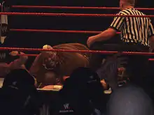 Viscera began wrestling in pajamas and making overtly sexual gestures in the ring. He became smitten with Raw ring announcer Lilian Garcia and tried different tactics to seduce her every week.[30][31] At Vengeance in June, Garcia finally reciprocated, proposing to him in the center of the ring, only to be turned down and left crying in the ring when The Godfather arrived with many of his hos to show Viscera what he would be leaving behind if he got married.[32] At the Royal Rumble, Viscera competed in the Royal Rumble match where he was eliminated by Carlito and Chris Masters. At WrestleMania 22, Viscera won an 18-man interpromotional battle royal. Viscera then teamed with Val Venis to form V–Squared. They teamed together for nearly nine months, mainly on Heat. They challenged for the World Tag Team Championship on several occasions, but never held the title.[33] When Venis was sidelined with a legitimate injury in April 2006, Viscera returned to singles wrestling. He attempted to reconcile with Garcia, but was interrupted and attacked by Umaga during his proposal.[34] Two weeks later, when Garcia was legitimately and accidentally knocked from the ring apron by Charlie Haas and sprained her wrist,[35] the incident was worked into a storyline of Haas and Viscera fighting over Garcia.[36] After Lillian declared she wanted to be just friends, Haas seemingly raked Viscera in the eye, with Viscera feigning to accidentally Samoan slam Lillian. After Viscera gave Lillian the Samoan slam, both men laughed about the incident, in the process turning Viscera heel once again.[37] The team split up when Haas reunited with Shelton Benjamin to reform The World's Greatest Tag Team.