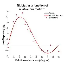 It has been reported that the magnitude and the direction of the perceived orientation shift depends on the relative orientation between test and contextual stimuli (see Fig.3). Psychophysics experiments have shown that relative orientations between 0 deg and about 50 deg produce repulsion effects (the test line or grating tends to rotate away from the contextual stimulus), which is known as the direct form of the tilt effect; but larger relative orientations up to 90 deg produce attraction effects (the test line or grating tends to rotate towards the contextual stimulus), which is known as the indirect form of the tilt effect. It has been observed repeatedly that indirect effects are smaller than direct effects.[2][3][4] The repulsion peak is about 3 degrees usually when the relative orientation between the test and contextual stimuli is around 20 degrees; and the attraction peak is usually maximally 0.5 degrees when the relative orientation is around 70 degrees (see Fig.3).