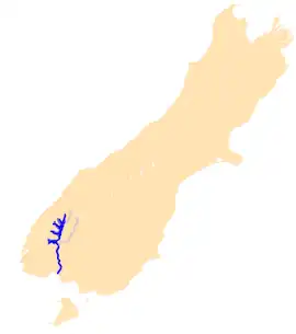 The Waiau River is the largest river in the Southland region of New Zealand.[1] 'Waiau' translates to 'River of Swirling Currents'.[2] It is the outflow of Lake Te Anau, flowing from it into Lake Manapouri 10 kilometres (6 mi) to the south, and from there flows south for 70 kilometres (43 mi) before reaching the Foveaux Strait 8 kilometres (5 mi) south of Tuatapere. It also takes water from Lake Monowai.