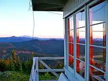 The original fire lookout tower was built on this site in 1926 and was a small cabin. In 1929 a cupola style lookout replaced the cabin. The current flat top lookout was built in 1956.[1] The lookout is currently unstaffed and no longer a functioning lookout.[2]