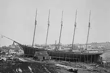 Preparing schooner Governor Ames for launch, 1888