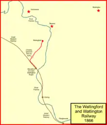 The Wallingford railway branch line was a 2.5 mi (4.0 km) branch line between the market town of Wallingford and the Great Western Railway main line at Wallingford Road in Oxfordshire. The railway, which opened in 1866, was originally planned to go a further 6 mi (9.7 km) to Watlington but this was never completed because of insufficient funds. Instead Watlington was reached by a 9 mi (14 km) line completed by the Watlington and Princes Risborough Railway company in 1872. After the Wallingford branch line opened, it ran regular passenger shuttle services to the GWR mainline for almost a century. It closed to passengers in 1959; the line escaped the Beeching Axe, remaining open for goods services until 1981.