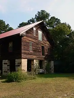The gin house is a 2+1⁄2-story-tall, hand-hewn timber frame structure, approximately 36 feet (11 m) wide and 56 feet (17 m) deep. The frontmost two-thirds of the structure is supported by tall, 2 feet (0.61 m) thick granite ashlar pillars that form a square, open-air space on the ground floor in which the mule track and power shaft were located. The rear third of the gin house rests on short, granite rubble piers, and housed the ground-floor pressing and packaging rooms. Most of the ginning equipment resided on the second floor of the gin house. The third floor was used for storage of baled cotton.