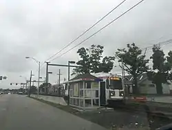 Walnut Street is a SEPTA Media-Sharon Hill Trolley Line stop in Upper Darby Township, Pennsylvania. It is officially located at Garrett Road and Walnut Street, but Bywood Avenue is also included as it parallels the north side of the line. The station serves both Routes 101 and 102, and only local service is provided on both lines. The station contains two platforms with plexiglass bus-type shelters on both sides of the tracks, both of which are at the far end of each platform.