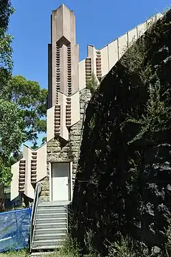 The incinerator is set over three levels and cascades down the sloping hillside in response to the functional requirements of its operation. The building comprises a concrete frame structure clad externally with a combination of rough cut sandstone blocks and decorative rendered concrete, utilising Griffin's favourite triangular motif. Windows are generally timber framed except for the aluminium suites of the larger areas of glazing added in the early 1980s conversion. The roof is framed with steel trusses and covered with green concrete tiles. It is not known whether these tiles were original or were installed in the 1980s work.[13][1]