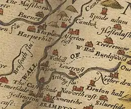 Castlesteads Mansion is one of the most important buildings in Walton.[4] It is listed as a grade II building.[13] It was built at the end of the 18th century by the Johnson family.[4] It is believed that the estate was previously owned by the Dacre family who built "Walton House" using stones from the nearby Hadrian's Wall. The Johnson family purchased the estate in 1789 and replaced "Walton House" with a larger mansion, known as Castlesteads. It is located on the site of the Roman fort of Camboglanna.[14] The mansion is south east of Walton[4] and is surrounded by 75 acres (30 ha) of woods, it also looks over the River Irthing.[4] In 1839, William Ford described Castlesteads in his journal as being "an elegant and modern residence." At the time of this description Castlesteads was known as "Walton House" and was occupied by William Johnson. Ford also states that many "Roman remains" were dug up and are preserved at Castelesteads.[6]