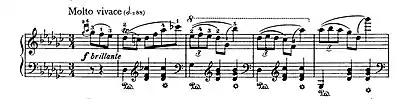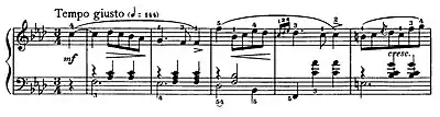 The Waltz Op. 70, No. 1, in G-flat major was composed in 1832.[4] It is written in the "brilliant style". According to Jeffrey Kallberg, "the unpublished waltzes also capture the joyfulness and glitter of the dance hall and salon, as we can hear in the waltzes in E major, A-flat major [KK IVa/13] (Chopin's only waltz notated in three-eighth metre), and, especially, in G-flat major, Op. 70, No 1."[1][4]