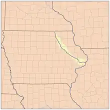 The Wapsipinicon River (/wɒpsɪˈpɪnɪkɒn, -kən/,[4] locally known as the Wapsi) is a tributary of the Mississippi River, approximately 300 miles (480 km) long,[5] starting near the southeastern border of Minnesota and running through northeastern Iowa in the United States. It drains a rural farming region of rolling hills and bluffs north of Waterloo and Cedar Rapids.