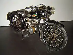 | 1932 | A machine fitted with a 147 cc Villiers two stroke engine was available.[58] The following description is from (apparently promotional) press coverage describing improvements over the previous year's model. "These machines are totally redesigned, having visible top rail, tapering away under the saddle, and giving exceptionally low riding position, and gaining very high ground clearance." The front forks had enclosed webbing, apparently to strengthen them. It was fitted with electric light, battery and dimmer. Petrol consumption was approximately 150 mpg.