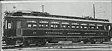 Initial passenger equipment running from Baltimore-Washington to Annapolis was the "classic" 1900-1910 arch window all wood body truss rod frame interurban coach. In the 1920s when passenger business was good, the line purchased and operated steel two car articulated (attached body with a common center truck/boogie) coaches from Baltimore to Annapolis.[8][9] This equipment later went to the Milwaukee Electric Line in Wisconsin.[10]