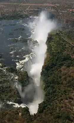 The Zambezi River, shown here at the Victoria Falls, is rich in water. However, most Zambians live too far from the river to benefit from it, so that water is often scarce during the dry season.