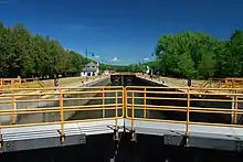 Construction of the Waterford Flight began in 1905 and took 10 years to complete.[1][2] The 5 massive locks dwarfed the previous iterations and were mandated to be 328 feet (100 m) long, 45 feet (14 m) wide, and 12 feet (3.7 m) deep.[2] These dimensions became the standard on the Barge Canal System and have been maintained to this day. In addition to the locks, there are two large guard gates at the northern end of the flight. These gates can be lowered to block additional flow of water from the Mohawk River through the locks to prevent damage during floods.[3] The locks have undergone periods of major restoration in the past couple of decades, including replacement of lock doors and resurfacing of the concrete within the locks themselves.[4]