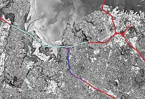 ![]() While generally considered a "tunnel project", the Waterview Connection also included other large motorway works. The connection consists of the purple (above ground) and dark blue (bored tunnels) sections. The section of SH16 with extra lanes added is shown in light blue. | |