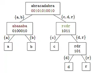A wavelet tree on the string "abracadabra". At each node the symbols of the string are projected onto two partitions of the alphabet, and a bitvector denotes to which partition each symbol belongs. Note that only the bitvectors are stored; the strings in the nodes are only for illustratory purposes.