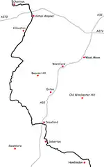 The north-west end is at the car park on top of Walbury Hill, near to the landmark Combe Gibbet, and the south-east end is Emsworth town square.