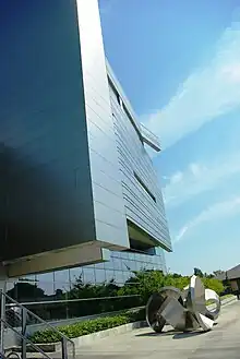 Energy efficient and sustainability features designed into the project led to a LEED Gold certification from the U.S. Green Building Council.[9] Elements that led to this include landscaping that reduces runoff from rainwater, much natural light, a more efficient HVAC system that is located under the floors, and a location near public transit.[9] Landscaping includes using drought resistant native species to reduce the need for irrigation.[13] The floor-based HVAC system is more energy efficient and helps keep the temperature of the entire building more even and uses radiant heating and cooling.[6][18] Additionally, the construction used environmentally friendly sealants, carpets, paints, and adhesives as well as preventing 90% of the construction waste from entering landfills.[9] Also, potable water usage is reduced by 40% due to the use of low-flow sinks, showers, and toilets.[9] The contractor also recycled 90% of the materials from the building that previously occupied the site.[9]
