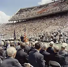 On September 12, 1962, a warm and sunny day, President Kennedy delivered his speech before a crowd of about 40,000 people, at Rice University's Rice Stadium. Many individuals in the crowd were Rice University students.[9][11] The middle portion of the speech has been widely quoted: