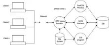 PC clients communicating via the network with a web server serving static content only