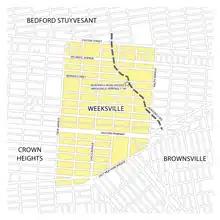 The village itself was established by a group of African-American land investors and political activists, and covered an area in the borough's eastern Bedford Hills area, bounded by present-day Fulton Street, East New York Avenue, Ralph Avenue and Troy Avenue.[1] A 1906 article in the New York Age recalling the earlier period noted that James Weeks "owned a handsome dwelling at Schenectady and Atlantic Avenues."