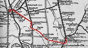 | Weinheim–Worms railway | ||||||||||||||||||||||||||||||||||||||||||||||||||||||||||||||||||||||||||||||||||||||||||||||||||||||||||||||||||||||||||||||||||||||||||||||||||||||||||||||||||||||||||||||||||||||||||||||||||||||||||||||||||||||||||||||||||||||||||||||||||||||||||||||||||||||||||||