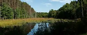 Wells State Park is a public recreation area located off Route 49 in the town of Sturbridge, Massachusetts. The state park includes frontage on Walker Pond and the scenic metamorphic rock cliff face of Carpenter Rocks. Terrain is rugged with ledges interspersed between wetlands. Woodlands are of the oak-hickory forest and northern hardwood forest types with groves of eastern white pine. The park is managed by the Massachusetts Department of Conservation and Recreation.[3]