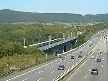The Werra viaducts near Hedemünden, Germany are two bridges crossing the valley of the river Werra. They are located in southern Lower Saxony and provide crossings for the A 7 motorway and the Hanover-Würzburg high-speed rail line. The bridges are located 33 metres apart from each other.