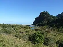 One of the earliest individuals associated with the area is Tiriwa, a chief of the supernatural Tūrehu people, who is involved with the traditional story of the creation of Rangitoto Island, by uplifting it from Karekare on the west coast.[54][55] The early Polynesian navigator Kupe visited the west coast. The Tasman Sea alongside the coast was named after Kupe,[20] and traditional stories tell of his visit to Paratutae Island, leaving paddle marks in the cliffs of the island to commemorate his visit.[18] The Tainui tohunga Rakatāura (also known as Hape) was known to have visited the region after arriving in New Zealand, naming many locations along the west coast.[15] He is the namesake of the Karangahape Peninsula at Cornwallis, as well as the ancient walking track linking the peninsula to the central Tāmaki isthmus (part of which became Karangahape Road).[56][57]