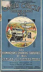 Route 11 was Europe's longest urban bus route after Coventry's route 360 until it was withdrawn in 2016.[3] It first came into existence as two routes in 1923: route 10 ran from King's Heath to the King's Head (Hagley Road) via Cotteridge, and route 11 from Six Ways Erdington to Acocks Green and Moseley. The route was first operated as a complete circuit on 26 April 1926, the idea being to better link the suburbs of Birmingham, as most routes at that time travelled in and out of the city [4]