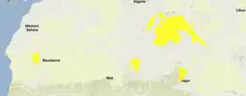 This ecoregion has an area of 258,100 km2 (99,700 sq mi). The boundaries for the largest part of this ecoregion, which includes the Tassili n'Ajjer Ahaggar and Aïr (or Azbine) massifs, follow the 'regs,' 'hamadas' and 'wadis' above the 1,000 m contour. This covers a good part of southeast Algeria. These areas reach almost 3,000 meters in altitude. Additional areas further south were included within this ecoregion, including the Aïr ou Azbine in northern Niger, Dhar Adrar in Mauritania, and Adrar des Iforas in Mali and Algeria, using the 500 m-elevation contour.[2]