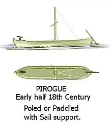 The larger pirogue is more famous on the lower Mississippi River. The earlier ones were carved from cypress and sycamore. Some of these were nearly 50 feet (15 m) long and 5 feet (1.5 m) wide. These French pirogues often had a small sail which could relieve them of their pole and paddle propulsion. As their carpenters came onto the frontier, they made them with planks and a flat bottom. Spanish vessels on the Mississippi River system's shoal waters were similar.
