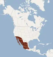 Its range includes the Southwestern United States of Arizona, California, and New Mexico, in addition to parts of Mexico. It is found in West and Central Mexico, as well as Baja California.[1]