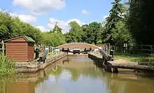 Having completed a multimillion-pound B2133 road bridge-centred project (see below), restoration has continued northwards. Devil's Hole Lock (lock 6) had been partially destroyed by the Canadian army as part of a training exercise in 1942. It has been rebuilt and extended to take 72-foot (22 m) narrow boats. The lock was reopened on 17 April 2010, and the opening ceremony was carried out by Colonel Paul Rutherford, the Senior Army Adviser to the Canadian High Commissioner.[23] Southland Lock (lock 7) required significant rebuilding, as many of the original bricks were removed in the 1930s, to be re-used by a local religious order.[24] The lock was reopened on 21 June 2014 by Simon Carter, a local landowner with land adjoining this section of the canal.[25] Working parties have since concentrated on the building of Gennets Bridge Lock (lock 8), a major exercise requiring the construction of a new concrete shell, faced with locally made bricks, and a bridge for a bridleway[26] as nothing was left of the original lock structure.