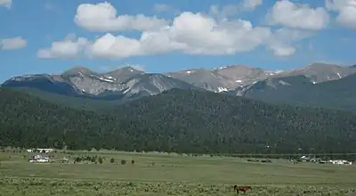 Wheeler Peak is the highest natural point in the U.S. state of New Mexico. It is located northeast of Taos and south of Red River in the northern part of the state, and just 2 miles (3.2 km) southeast of the ski slopes of Taos Ski Valley. It lies in the Sangre de Cristo Mountains, the southernmost subrange of the Rocky Mountains. The peak's elevation is 13,167 feet (4,013 m).