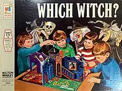 Which Witch? is a children's board game published in 1970 by the Milton Bradley Company, and was invented by Joseph M. Burck of Marvin Glass and Associates. The board represents a haunted house with four large rooms: the Broom Room, the Witchin' Kitchen, the Spell Cell and the Bat's Ballroom, assembled before play into a three-dimensional model house with vertical walls, and a large plastic chimney in the center. There are four tokens, colored red, yellow, blue and green. Each token is shaped like a child, either a boy or a girl, with four corresponding mouse tokens of identical color.