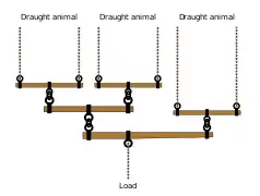 Whippletrees are used in tension to distribute forces from a point load to the traces of draught animals (the traces are the chains or straps on each side of the harness, on which the animal pulls). For these, the whippletree consists of a loose horizontal bar between the draught animal and its load. The centre of the bar is connected to the load, and the traces attach to its ends.[1][2]