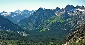 During the Pleistocene period dating back over two million years ago, glaciation advancing and retreating repeatedly scoured the landscape leaving deposits of rock debris.[5] The U-shaped cross section of the river valleys is a result of recent glaciation. Uplift and faulting in combination with glaciation have been the dominant processes which have created the tall peaks and deep valleys of the North Cascades area.