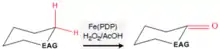 In the case where there is an electron activating group (EAG) near aliphatic C–H bonds, the EAG will donate electron density to the adjacent C–H bonds to promote oxidation at that site. In the case at the right the cyclopropane EAG activates the aliphatic C–H bonds adjacent to it via hyperconjugation (oxygen and nitrogen heteroatoms can also do this). The bonds highlighted in red will undergo oxidation preferentially to other C—H bonds in the molecule. The observed product is shown on the right and consists of a carbonyl in place of the two aliphatic C–H bonds. Other oxidants such as TFDO and DMDO have also been shown to oxidize aliphatic C—H bonds selectively via stereoelectronic activation.[2][7]