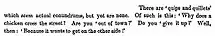 There are 'quips and quillets' which seem actual conundrums, but yet are none. Of such is this: 'Why does a chicken cross the street?['] Are you 'out of town?' Do you 'give it up?' Well, then: 'Because it wants to get on the other side!'