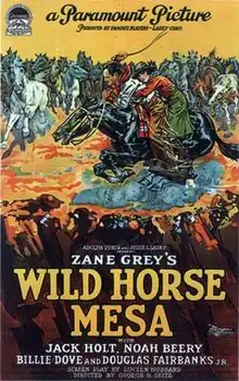 Wild Horse Mesa is a 1925 American silent Western film directed by George B. Seitz and starring Jack Holt, Noah Beery Sr., Billie Dove, and Douglas Fairbanks Jr.[1][2] Based on the novel Wild Horse Mesa by Zane Grey, the film is about a rancher who, desperate for money, decides to trap and sell wild horses using barbed wire. The local Navajo tribe tries to persuade him not to do it. The film was produced by Famous Players–Lasky and released by Paramount Pictures. Wild Horse Mesa was filmed on location in Colorado. Prints of the film have survived.[3][4]