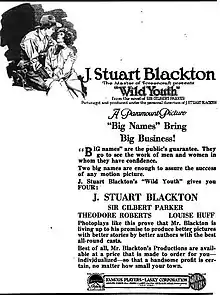 Wild Youth is a lost[1] 1918 American silent drama film directed by George Melford and written by Beulah Marie Dix. The film stars Louise Huff, Theodore Roberts, Jack Mulhall, James Cruze, and Adele Farrington. It is based on a novel by Gilbert Parker. The film was released on March 18, 1918, by Paramount Pictures.[2][3] It is not known whether the film currently survives,[4] which suggests that it is a lost film.