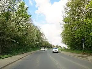 ![]() Willerby and Kirk Ella station was located on the embankment left of today's B1232 road. After the bend, the new road follows the former alignment of the railway. | |